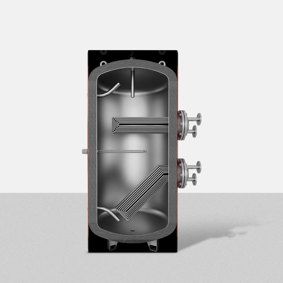 Die Spulen im Heizkessel übertragen die Energie der von der Energiequelle kommenden Flüssigkeit auf das Leitungswasser. Dank der Flansche am Gehäuse können die Spulen leicht entfernt, gereinigt und bei Bedarf ausgetauscht werden. Dies beschleunigt den Wartungsprozess und hält die Leistung des Systems lange aufrecht.